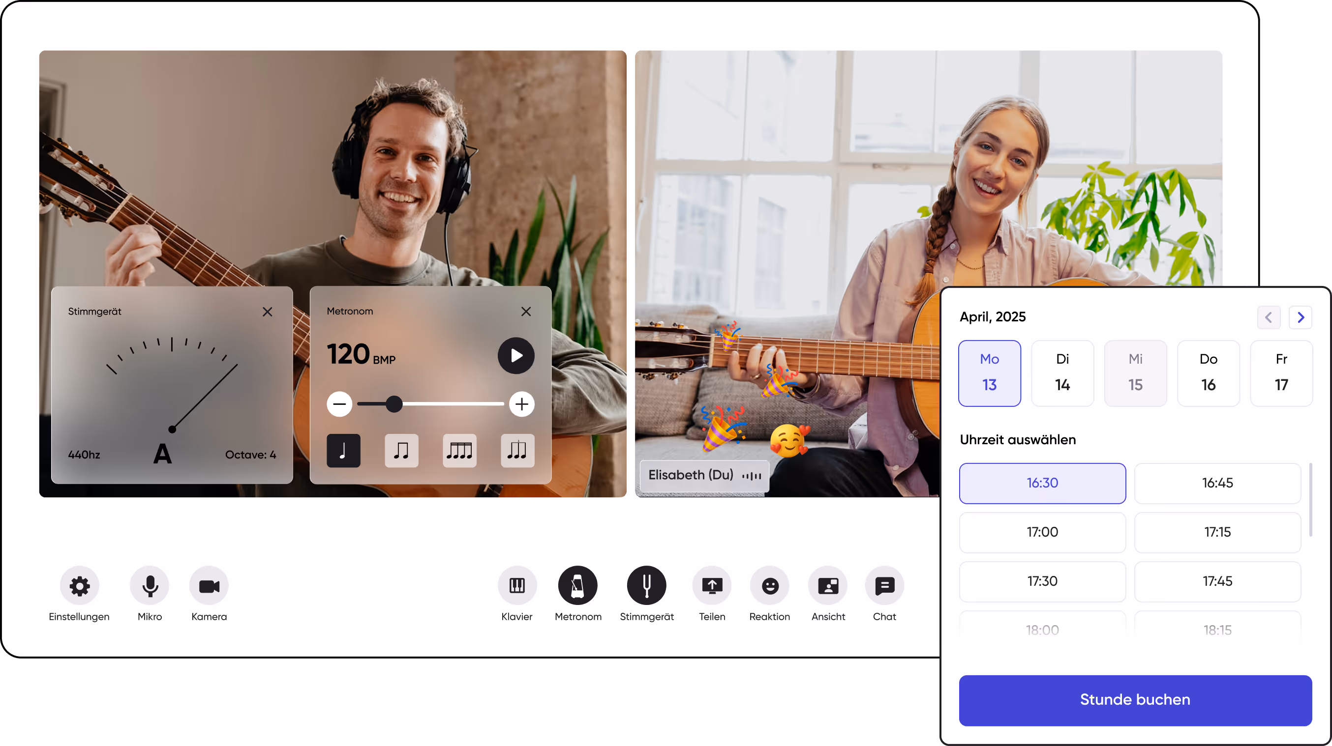 Wir bieten dir persönlichen Gitarrenunterricht und unsere Gitarrenlehrer begleiten dich live Schritt für Schritt beim Gitarre spielen lernen. Für den Gitarrenunterricht online verwenden unsere Gitarrenlehrer ausschließlich unsere selbst entwickelte Online Musikunterricht Software für den bestmöglichen Klang.