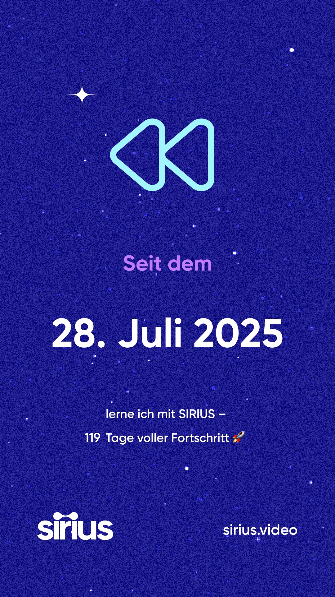 bist du bei SIRIUS. Das ist 119 Tage her — und schau, wie weit du seitdem gekommen bist! 🚀