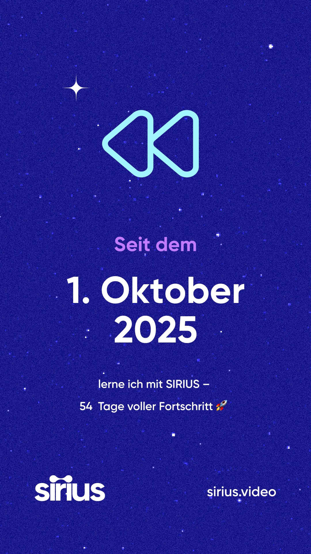 bist du bei SIRIUS. Das ist 54 Tage her — und schau, wie weit du seitdem gekommen bist! 🚀